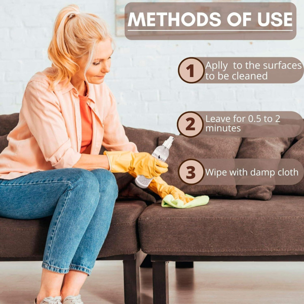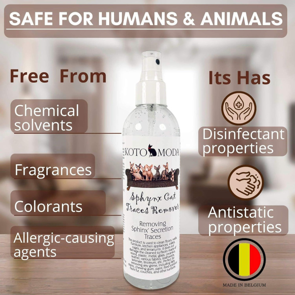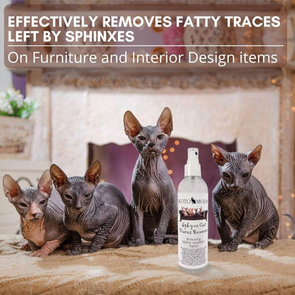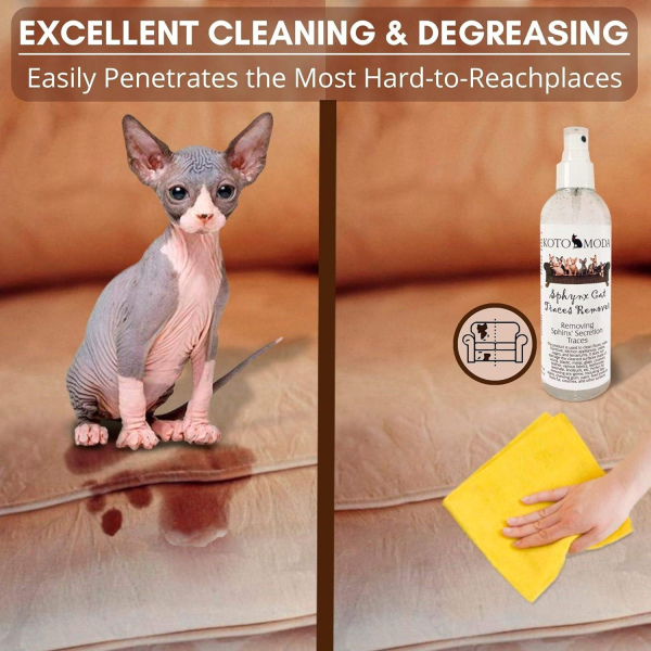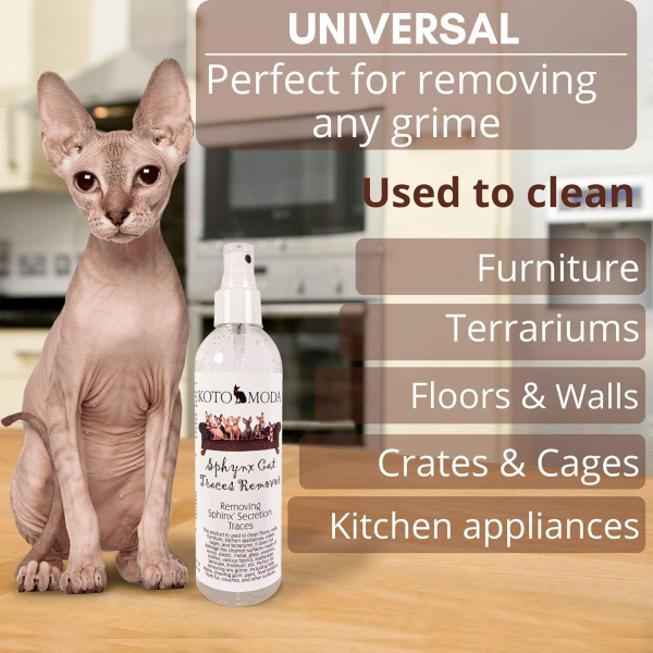 The product is used to clean floors, walls, furniture, kitchen appliances, crates, cages, and terrariums. It does not damage the cleaned surfaces made of wood, plastic, metal, glass, ceramics, leather, various fabrics, leatherette, laminate, linoleum, etc. Perfect for removing any grime, including fatty stains, chewing gum, paint, feed residues from fur, couches, and other surfaces. Effectively removes fatty traces left by Sphinxes on furniture and interior design items.