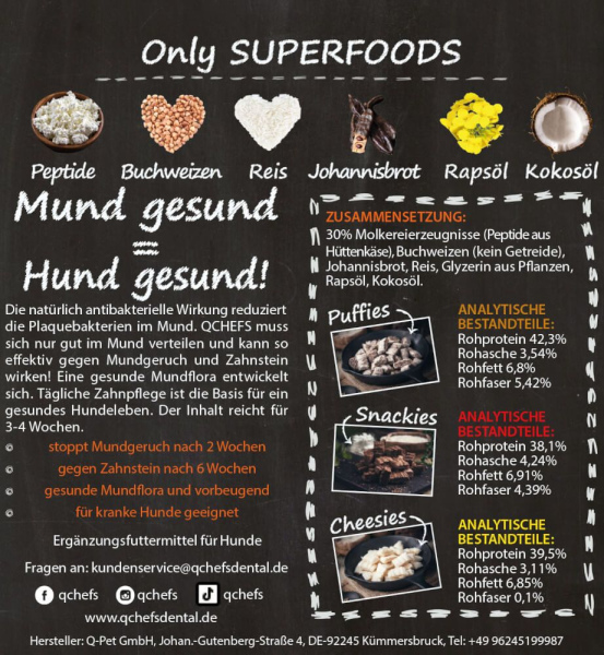 Crunchy and pleasant to chew. QCHEFS dental flakes or QCHEFS cheese bones are popular. Provide water. Complementary feed for dogs. You cannot overfeed the QCHEFS products, but they should be given once in the evening to achieve the dental effect. This is a minimum specification.