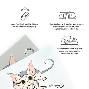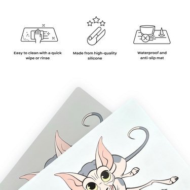 The silicone mat is 100 percent waterproof to help protect floors from messy food and water spills made from food-grade silicone; silicone mats can be easily folded to discard crumbs and are dishwasher safe, mat measures 18 by 13 inches; a perfect option for both cats and dogs; mat sizes can also accommodate raised feeders and pet fountains.