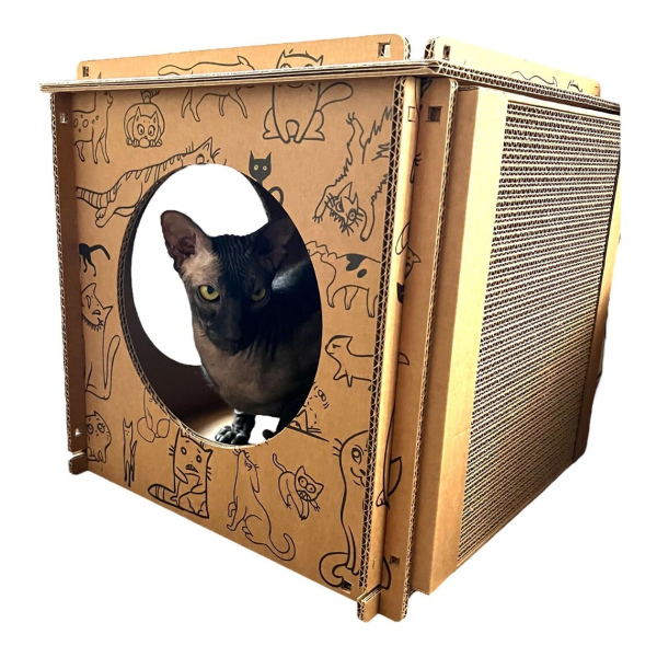 The premium cat house is made from recyclable cardboard with a scratch panel. Cube 36*36*36cm.