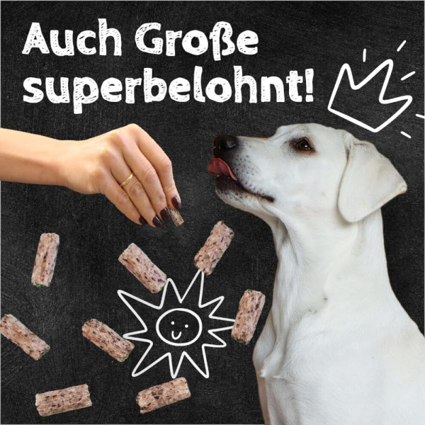 Šī papildbarība ir piemērota arī kucēniem un senioriem – viegli sagremojama un labi panesama – pat jutīgiem dzīvniekiem un cilvēkiem ar alerģijām. Nodrošiniet ūdeni. Papildbarība suņiem.